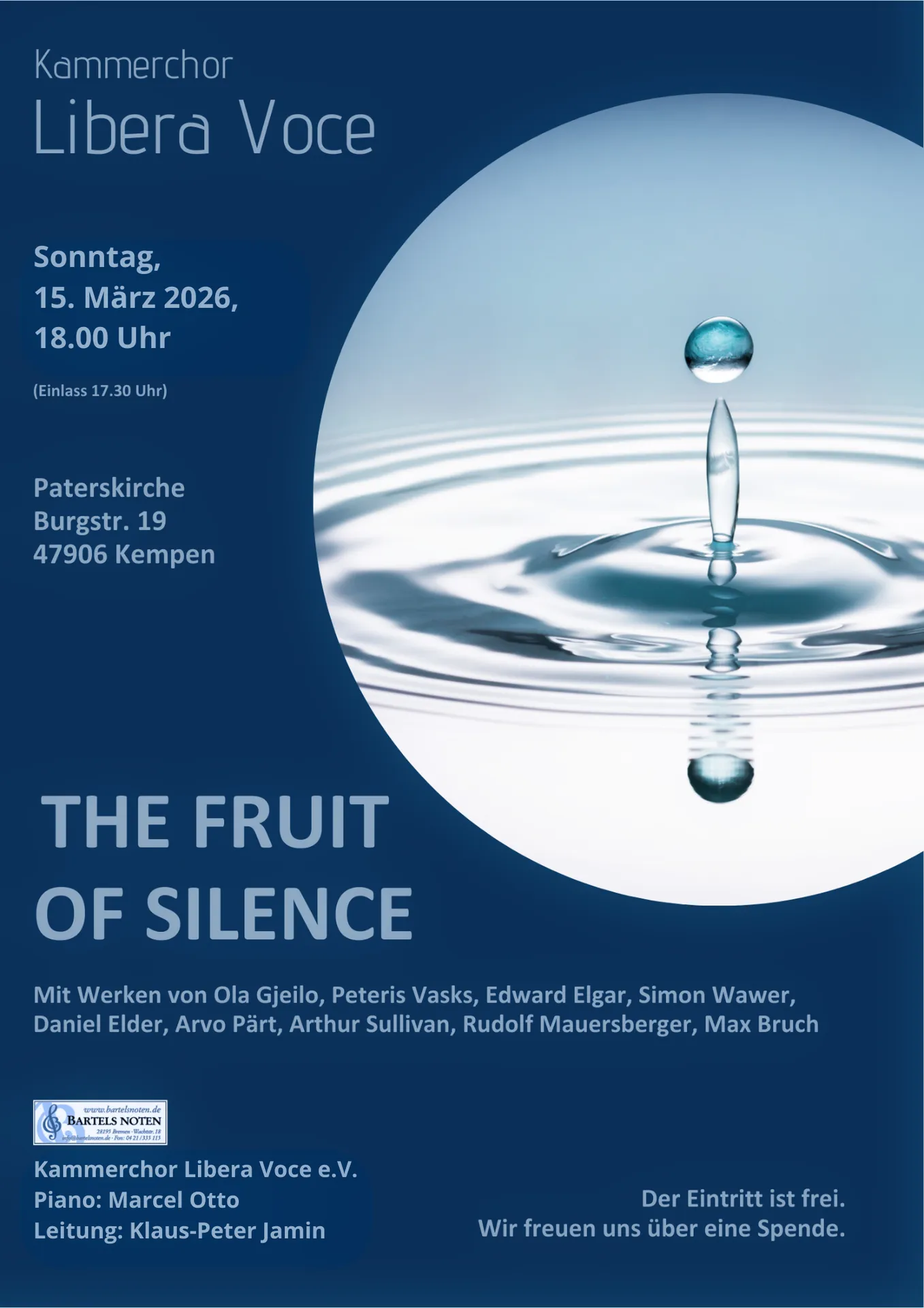 Die ausgewählten Chorwerke verschiedenster Komponisten stehen inhaltlich und musikalisch in Beziehung zum Konzerttitel „THE FRUIT OF SILENCE“ – die Frucht der Stille. Diesem Auftragswerk des lettischen Komponisten Pēteris Vasks liegen Worte um Frieden von Mutter Teresa zugrunde.